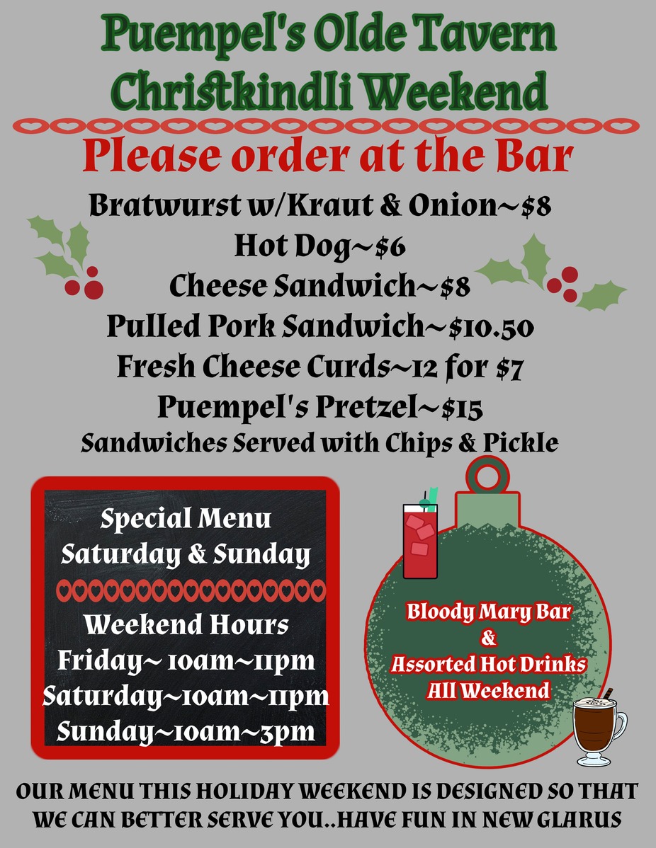 Join us for lunch or a snack during Christkindl weekend in New Glarus. Favorite brews are on tap and we have some nice "warmer uppers."